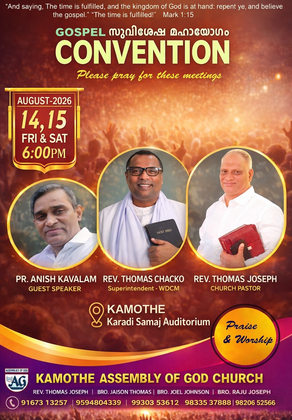 कामोठे (नवी मुंबई): असेंबली ऑफ गॉड – कामोठे चर्च के तत्वावधान में दो दिवसीय आध्यात्मिक कन्वेंशन 14 और 15 अगस्त 2026 (शुक्रवार और शनिवार) को कामोठे स्थित कराड़ी समाज ऑडिटोरियम में आयोजित किया जाएगा।