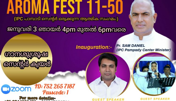 ഇതിന്റെ ഭാഗമായി ദൈവഹിതമായാൽ ഐപിസി പാമ്പാടി സെന്ററിന്റ ആഭിമുഖ്യത്തിൽ ജനുവരി മാസം മൂന്നാം തീയതി വൈകിട്ട് നാലുമണി മുതൽ ആറുമണിവരെ AROMA FEST 11-50 നടത്തുവാൻ തീരുമാനിച്ചിരിക്കുന്നു.ഈ മീറ്റിങ്ങിലേക്ക് എല്ലാരുടെയും സഹകരണവും പ്രാർത്ഥനയും പ്രതീക്ഷിക്കുന്നു.