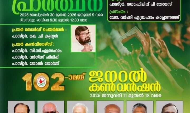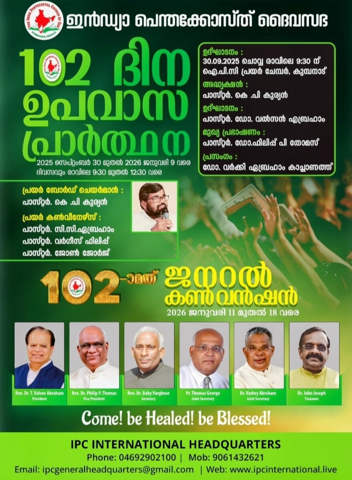 കുമ്പനാട്: ഇന്ത്യ പെന്തെക്കോസ്ത് ദൈവസഭയുടെ കുമ്പനാട് ഹെബ്രോൻപുരത്തുള്ള സഭാ ആസ്ഥാനത്ത് 2026 ജനുവരി 11 മുതൽ 18 വരെ നടക്കുന്ന നൂറ്റിരണ്ടാം ജനറൽ കൺവെൻഷന്റെ മുന്നോടിയായുള്ള നൂറ്റിരണ്ട് ദിവസം നീണ്ടുനിൽക്കുന്ന ഉപവാസ പ്രാർത്ഥനയോഗങ്ങൾ നാളെ ആരംഭിക്കും. 2025 സെപ്റ്റംബർ മുപ്പത് മുതൽ ആരംഭിക്കുന്ന പ്രാർത്ഥനയോഗങ്ങൾ 2026 ജനുവരി 9 വരെ എല്ലാ ദിവസവും രാവിലെ 9.30 മുതൽ 12.30 വരെ ഹെബ്രോൺപുരത്തുള്ള പ്രയർ ചേംബറിൽ ആയിരിക്കും യോഗങ്ങൾ.