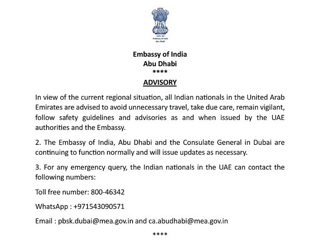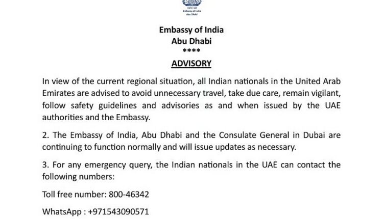 The Embassy of India, Abu Dhabi, has issued an advisory to Indian nationals in the UAE in view of the current regional situation following attacks on Iran.