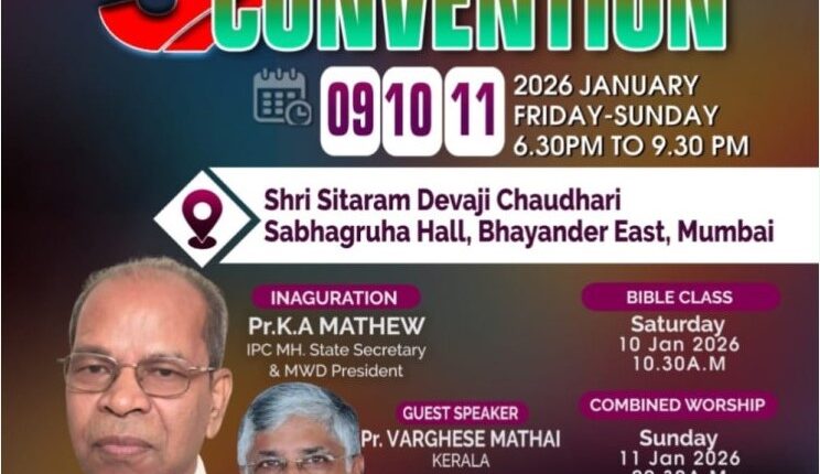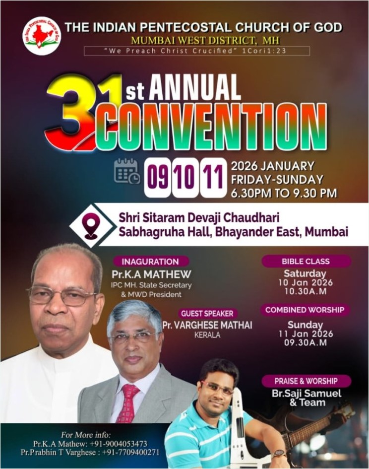 മുംബൈ: ഐപിസി മുംബൈ വെസ്റ്റ് ഡിസ്ട്രിക്ട് 31 മത്ക ൺവെൻഷൻ 2026 ജനുവരി 9 മുതൽ 11 വരെ മുംബൈ ബയെന്ദേർ ഈസ്റ്റ്, ഭയെന്ദേർ റെയിൽവേ സ്റ്റേഷൻ സമീപം ശ്രീ സീതാറാം ദേവാജി ചൗദരി സഭാ ഗൃഹയിൽ നടക്കും.