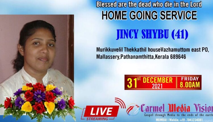 മുംബൈ: ചർച്ച് ഓഫ് ഗോഡ് നെരൂൾ മുൻ സഭാംഗവും ഇപ്പോൾ ഉൽവാ ദൈവ സഭാംഗവുമായ ജിൻസി ഷൈബു (41) താൻ പ്രിയം വെച്ച കർത്യസന്നിധിയിൽ ചേർക്കപ്പെട്ടു. ചികിത്സക്കായി കേരളത്തിൽ ആയിരുന്നു.കോന്നി വാഴമുട്ടം സ്വദേശിയാണ്. ഭർത്താവ്: ഷൈബു എം.ദാനിയേൽ. ഏകമകൾ : ജയ്മിമോൾ
