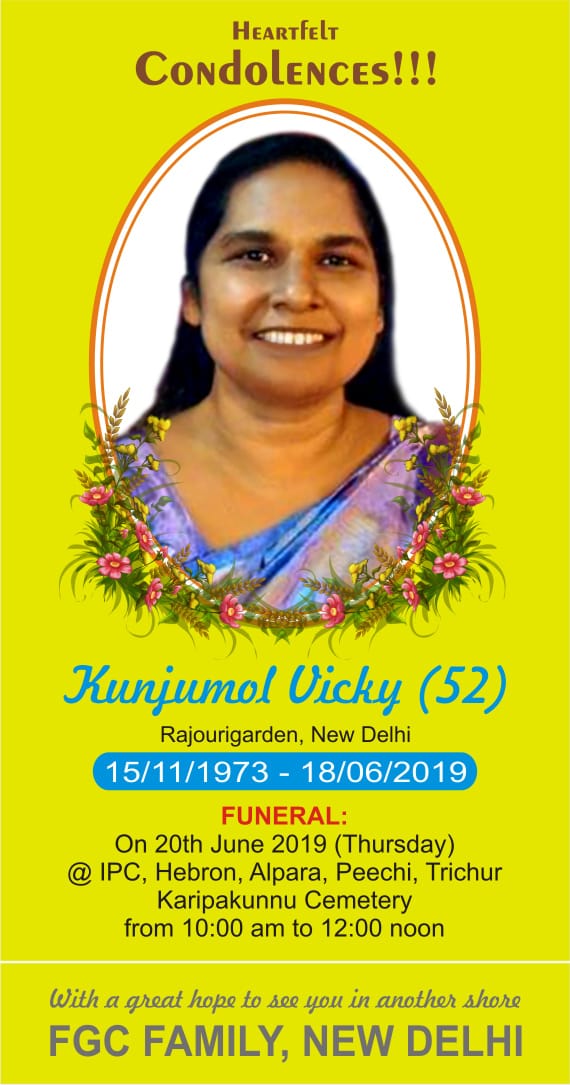തൃശൂർ: ആല്പാറ പരേതനായ ഇടപ്പാറ ശാമുവേലിന്റെ മകൾ കുഞ്ഞുമോൾ ( 52 ) കർതൃ സന്നിധിയിൽ ചേർക്കപ്പെട്ടു. സംസ്കാരം ജൂൺ 20ന് ആല്പാറ ഐ.പി.സി സഭയുടെ നേതൃത്വത്തിൽ രാവിലെ 9 ന് ശുശ്രൂഷ ആരംഭിച്ച് ഉച്ചക്ക് 12ന് കരിപ്പക്കുന്ന് സെമിത്തേരിയിൽ സംസ്കരിക്കും. ഭർത്താവ്: രാജു ദയാൽ, മകൾ: ഫേബാ ദയാൽ