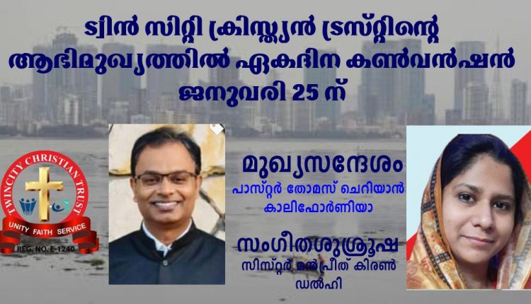 നവിമുംബൈ: കലമ്പൊലി, കാമോഠെ, പൻവേൽ എന്നീ പട്ടണങ്ങളിൽ നിന്നുള്ള ഹിന്ദി, മറാഠി, മലയാളം പെന്തെക്കോസ്തൽ സഭകളുടെ സംയുക്ത കൂട്ടായ്മയായ ട്വിൻ സിറ്റി ക്രിസ്ത്യൻ ട്രസ്റ്റിൻ്റെ ആഭിമുഖ്യത്തിൽ ഏകദിന ഓൺലൈൻ കൺവൻഷൻ ജനുവരി 25 ന് നടക്കും.